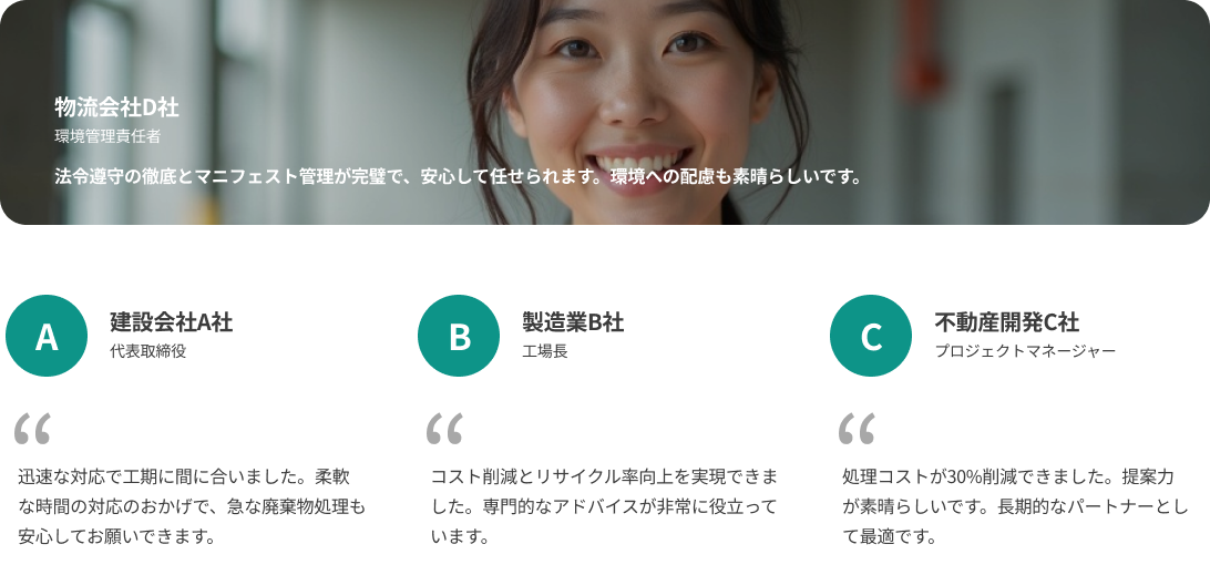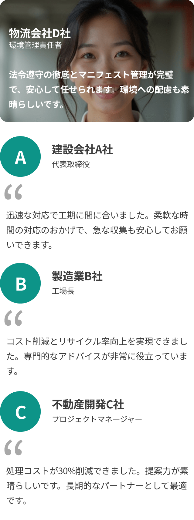 マニフェスト管理まで完全サポート。廃棄物処理業に基づいた適正な収集運搬を行い、お客様の法的リスクを最小限に抑えます。